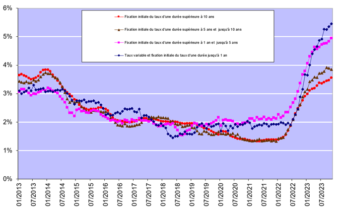 Les taux d’intérêt ont donc joué un rôle majeur dans l’évolution constatée l’an dernier. Sur la base des chiffres publiés par la Banque Nationale de Belgique, ces taux oscillaient en novembre 2023 entre 3,56% (pour les crédits à taux variable assortis d’une période initiale de fixité du taux de plus de 10 ans) et 5,45% (pour les crédits assortis d’une période initiale de fixité du taux jusque 1 an).