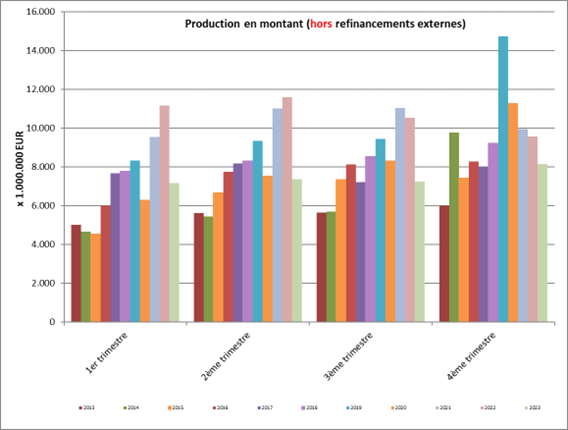 Au quatrième trimestre de 2023, 49.000 nouveaux crédits ont été octroyés pour un montant total de quelque 8,2 milliards EUR – hors refinancements externes.