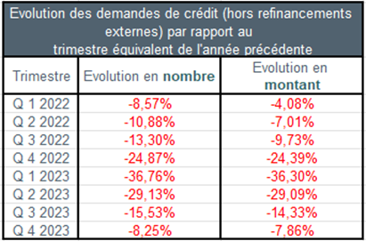 Le nombre de demandes de crédit, hors celles relatives aux refinancements externes, a connu au quatrième trimestre 2023 une baisse d’environ 8% par rapport au même trimestre de l’année précédente. Le montant sous-jacent des demandes de crédit a diminué un peu moins fortement, de l’ordre de près de 8%, au cours du dernier trimestre 2023.