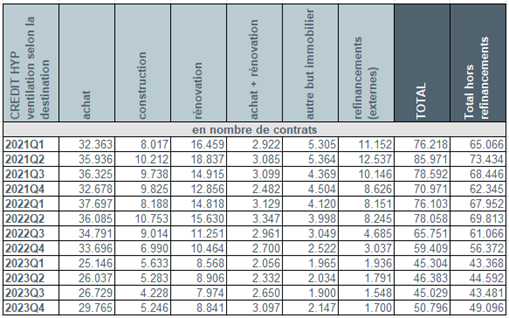 Le nombre de demandes de crédit pour l’achat d’un logement (-3.442) s’est contracté de -7,8%, celui pour la rénovation d’un logement (-706) de -6,1%, celui pour le construction d’un logement (-2.103) de -25,6% et celui des demandes de crédit pour d’autres destinations[1] (garage, terrain à bâtir...) (-458) de -14,3%. Le nombre de demandes de refinancements externes a enregistré une baisse de 21,5% au cours du dernier trimestre 2023. Une hausse du nombre de demandes de crédit a toutefois été enregistrée pour l’achat + rénovation (+23%).