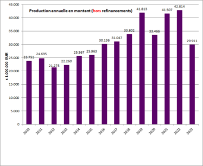 Bien que l’année n’ait pas été facile, plus de 180.000 dossiers de crédits, hors refinancement, ont été réalisés pour un montant de près de 30 milliards d’euros. Cela représente toutefois un recul de 30% par rapport à 2022.