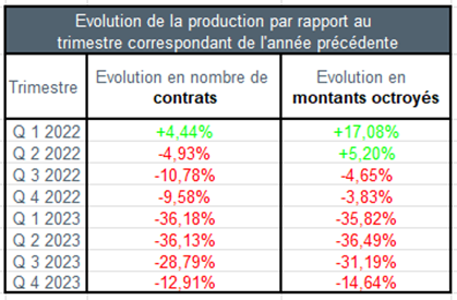C’est une baisse de 14,6% pour le montant des crédits qui a été accordé au quatrième trimestre 2023 par rapport au quatrième trimestre de l’année précédente. Si l’on compare avec 2020 (-27,7%) et avec le quatrième trimestre exceptionnel de 2019 (-44,6%), on note une baisse plus conséquente.