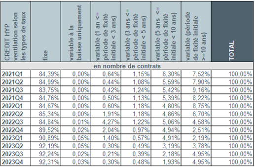 Au cours du quatrième trimestre 2022 également, plus de 9 emprunteurs sur 10 (97,3%) ont opté pour un taux d’intérêt fixe ou un taux d’intérêt variable assorti d’une période initiale de fixité des taux de minimum 10 ans. Environ 2,7% des emprunteurs ont privilégié un taux d’intérêt variable assorti d’une période initiale de fixité des taux entre 3 et 10 ans. Le nombre d’emprunteurs ayant choisi un taux variable annuellement s’est limité à 0,3%.