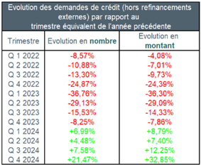 Le nombre de demandes de crédit, hors celles relatives aux refinancements externes, a connu au quatrième trimestre 2024 une hausse d’environ 21,5% par rapport au même trimestre de l’année précédente. Le montant sous-jacent des demandes de crédit a augmenté, de l’ordre de près de 33%, au cours du dernier trimestre 2024.