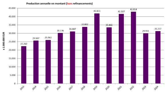 Au cours de l’année 2024, plus de 186.000 dossiers de crédits, hors refinancement, ont été réalisés pour un montant de plus de 31 milliards d’euros. Cela représente une hausse de plus de 4% par rapport à 2023.