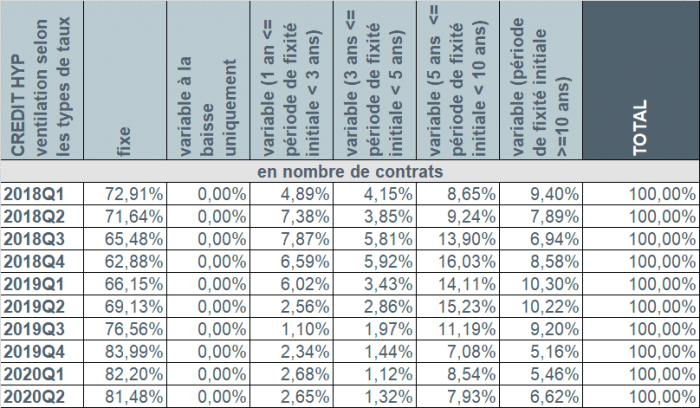Au cours du deuxième trimestre 2020, presque 9 emprunteurs sur 10 (88,1%) ont opté pour un taux d’intérêt fixe ou un taux d’intérêt variable assorti d’une période initiale de fixité des taux de minimum 10 ans. Environ 9% des emprunteurs ont privilégié un taux d’intérêt variable assorti d’une période initiale de fixité des taux entre 3 et 10 ans. Le nombre d’emprunteurs ayant choisi un taux variable annuellement n’atteignait qu’environ 2,7%.