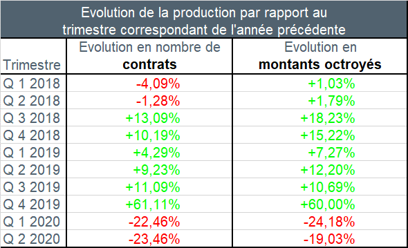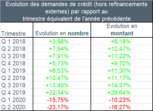 Le nombre de demandes de crédit a connu au deuxième trimestre 2020 une diminution de 23%, hors refinancements, par rapport au même trimestre de l’année précédente. Le montant de crédit correspondant a également connu une baisse de 16%.