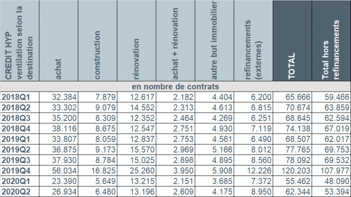 Par ailleurs, au cours du deuxième trimestre de 2020, seul le nombre de refinancements externes a connu une progression de 11,7%. Plus précisément 9.000 refinancements externes ont été octroyés pour un montant total d’un peu moins de 1,2 milliard EUR.