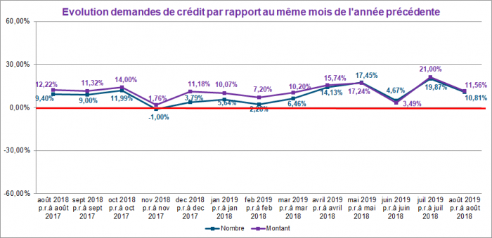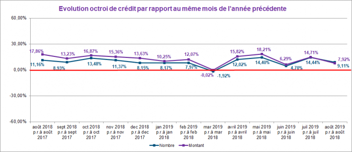 En août 2019, le nombre de demandes de crédit a augmenté de presque 11% par rapport à celui enregistré en août 2018. Le montant total correspondant à ces demandes a également augmenté de 11,5%. Ce même mois, le nombre de crédits octroyés a enregistré une augmentation d’un peu plus de 9%. Le montant des crédits octroyés a quant à lui également augmenté d’environ 8% par rapport à août 2018.