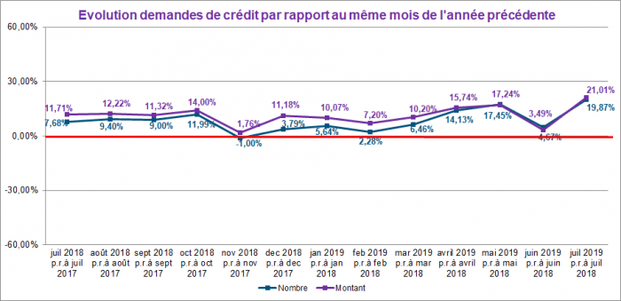 En juillet 2019, le nombre de demandes de crédit a augmenté de presque 20% par rapport à celui enregistré en juillet 2018. Le montant total correspondant à ces demandes a également augmenté de 21%. Ce même mois, le nombre de crédits octroyés a enregistré une augmentation de 14,5%. Le montant des crédits octroyés a quant à lui également augmenté de 14,5% par rapport à juillet 2018.
