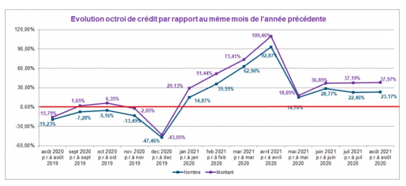 Ce même mois, le nombre de crédits octroyés a enregistré une augmentation d’environ 23%. Le montant des crédits octroyés a quant à lui augmenté de presque 38% par rapport à août 2020.