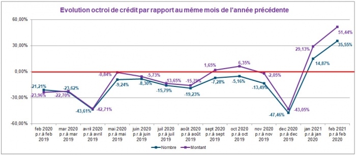 Ce même mois, le nombre de crédits octroyés a enregistré une augmentation d’environ 35,5%. Le montant des crédits octroyés a quant à lui augmenté de presque 52,5% par rapport à février 2020.