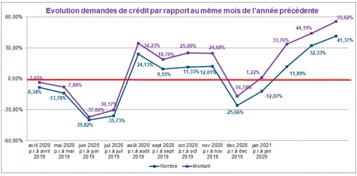 En février 2021, le nombre de demandes de crédit a augmenté d’environ 41% par rapport à celui enregistré en février 2020. Le montant total correspondant à ces demandes a même augmenté de presque 56%.
