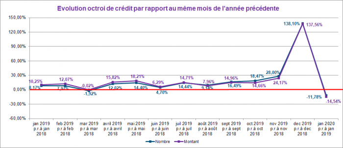 Ce même mois, le nombre de crédits octroyés a enregistré une diminution de presque 12%. Le montant des crédits octroyés a quant à lui également diminué d’environ 14,5% par rapport à janvier 2019.