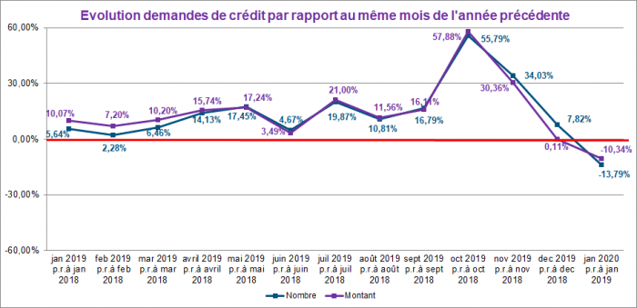 En janvier 2020, le nombre de demandes de crédit a diminué de presque 14% par rapport à celui enregistré en janvier 2019. Le montant total correspondant à ces demandes a également diminué d’environ 10%.