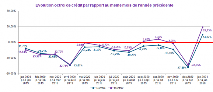 Ce même mois, le nombre de crédits octroyés a enregistré une augmentation d’environ 15%. Le montant des crédits octroyés a quant à lui augmenté d’un peu plus de 29% par rapport à janvier 2020.