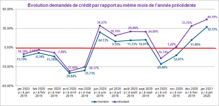 En janvier 2021, le nombre de demandes de crédit a augmenté d’environ 32% par rapport à celui enregistré en janvier 2020. Le montant total correspondant à ces demandes a même augmenté d’un peu plus de 44%.