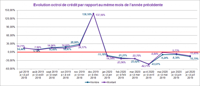Ce même mois, le nombre de crédits octroyés a enregistré une diminution de presque 16%. Le montant des crédits octroyés a quant à lui également diminué d’environ 13,5% par rapport à juillet 2019.
