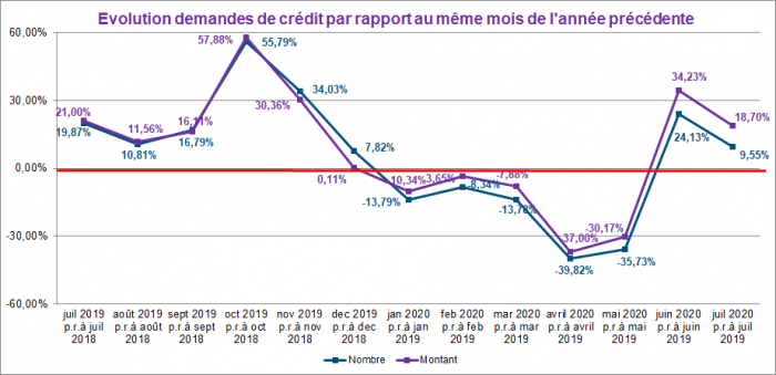 En juillet 2020, le nombre de demandes de crédit a augmenté d’environ 9,5% par rapport à celui enregistré en juillet 2019. Le montant total correspondant à ces demandes a également augmenté de presque 19%.