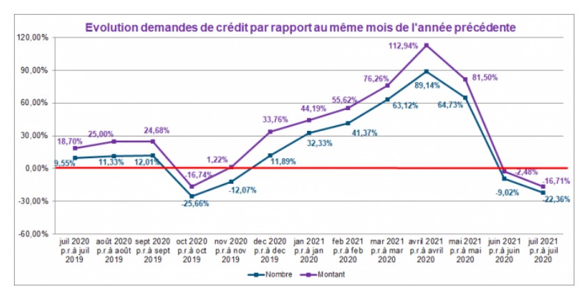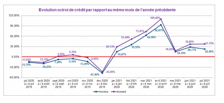 Ces chiffres de croissance s'expliquent par le fait que les chiffres relatifs aux crédits octroyés de juillet 2020 étaient encore bas en raison de la pandémie de covid-19 et du confinement associé du printemps. Par rapport au mois de juillet 2019, on constate un status quo (-0,5%) des crédits accordés (mais quand-même +16% en montant correspondant).