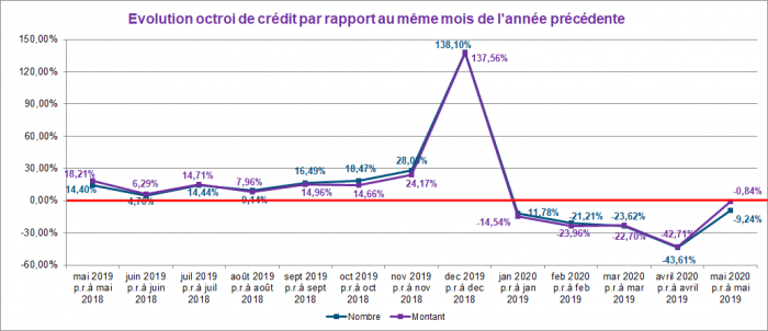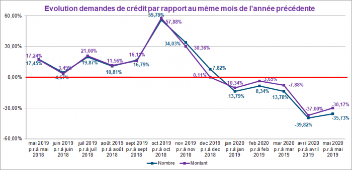 En mai 2020, le nombre de demandes de crédit a diminué de presque 36% par rapport à celui enregistré en mai 2019. Le montant total correspondant à ces demandes a également diminué de 30%.