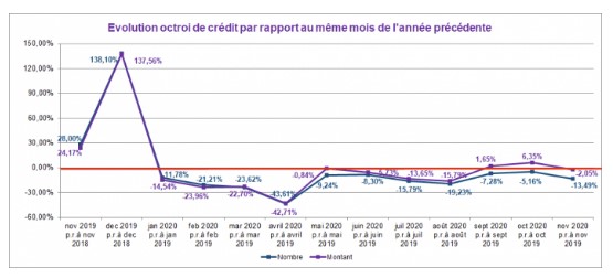Ce même mois, le nombre de crédits octroyés a enregistré une diminution d’environ 5%. Le montant des crédits octroyés a quant à lui toutefois augmenté d’un peu plus de 6% par rapport à octobre 2019.