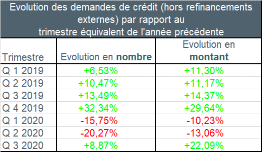 Le nombre de demandes de crédit a connu au troisième trimestre 2020 une augmentation d’un peu moins de 9%, hors refinancements, par rapport au même trimestre de l’année précédente. Le montant de crédit correspondant a également enregistré une progression, d’environ 22%.