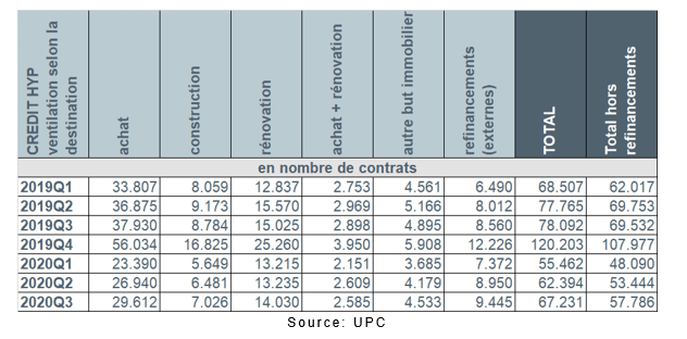 Du fait de la crise du coronavirus et des mesures gouvernementales allant de pair, telles que l'interdiction des déplacements non essentiels, la fermeture de secteurs non essentiels, etc., l’octroi de crédits hypothécaires a été fortement réduit au cours du deuxième trimestre. Au troisième trimestre, le marché de l’immobilier et la demande de crédits hypothécaires se sont rétablis, mais cette demande accrue ne s’est pas encore traduite dans les chiffres relatifs aux crédits octroyés.