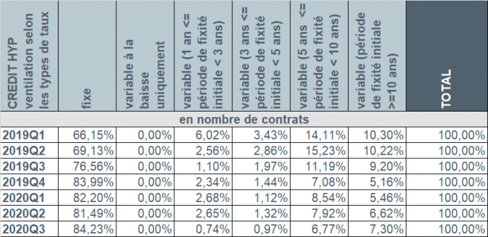 Au cours du troisième trimestre 2020, plus de 9 emprunteurs sur 10 (91,5%) ont opté pour un taux d’intérêt fixe ou un taux d’intérêt variable assorti d’une période initiale de fixité des taux de minimum 10 ans. Un peu moins de 8% des emprunteurs ont privilégié un taux d’intérêt variable assorti d’une période initiale de fixité des taux entre 3 et 10 ans. Le nombre d’emprunteurs ayant choisi un taux variable annuellement a atteint à peine 0,7%.