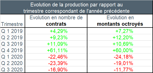 Au cours du troisième trimestre de 2020, le nombre de crédits octroyés, hors refinancements externes, a connu une diminution de presque 17% par rapport au troisième trimestre 2019. Le montant correspondant a diminué de presque 12%.