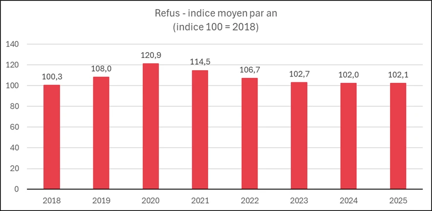Entre 2024 et 2025, le degré de refus est demeuré stable.