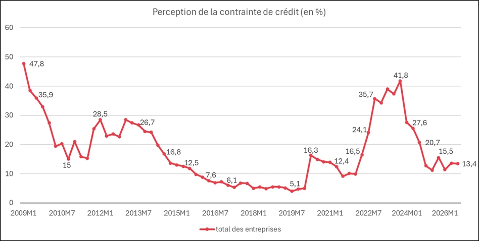 Le graphique ci-dessous montre l'évolution de la perception des contraintes de crédit. Une diminution traduit la perception d'un assouplissement des conditions de crédit. Une augmentation, quant à elle, indique que les entreprises pensent qu'il est moins facile d’obtenir un crédit.