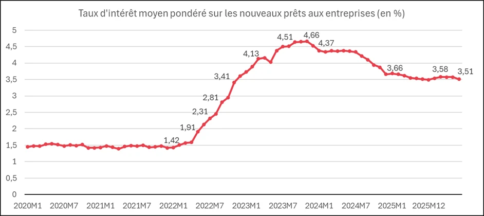 Le taux d'intérêt moyen pondéré sur les nouveaux crédits aux entreprises avait atteint un pic de 4,66 % en novembre 2023. En juillet 2025, ce taux moyen avait déjà baissé de plus d'un point de pourcentage pour s'établir à 3,49 %. Depuis, ce taux est demeuré assez stable : fin décembre 2025, il atteignait 3,51%.