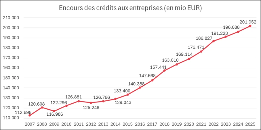 Fin décembre 2025, les crédits aux entreprises, y compris les crédits d'engagement (il s’agit par exemple des crédits de garantie ou des crédits documentaires), s'élevaient à 202 milliards d'euros , soit 3,0 % de plus qu'un an auparavant.