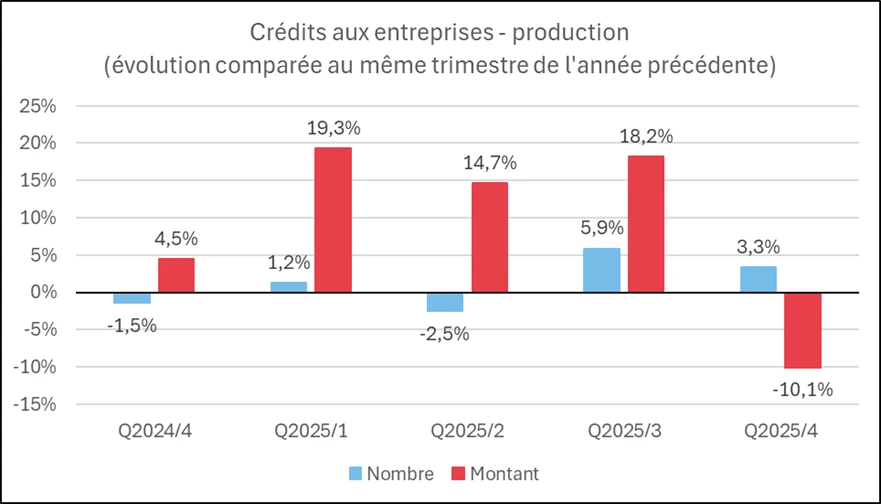 La hausse de la demande de crédit s'est traduite par une augmentation du nombre de nouveaux crédits accordés. Au quatrième trimestre de 2025, le nombre de crédits accordés aux entreprises a ainsi progressé de 3,3 % par rapport à la même période de 2024. Le montant des crédits accordés a baissé de 10,1% ce qui tient au fait qu’une banque a octroyé une série de très gros crédits au quatrième trimestre de 2024.