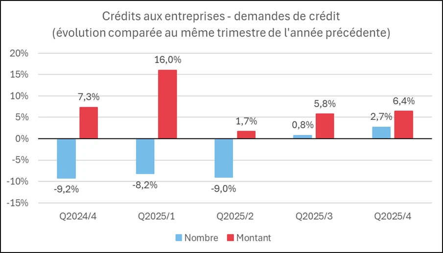Au quatrième trimestre de 2025, le nombre de demandes de crédit a augmenté par rapport au même trimestre de l'année précédente. Le nombre de demandes de crédit a ainsi progressé de 2,7 %. Les montants ont quant à eux connu une croissance de 6,4%.