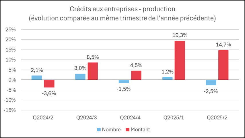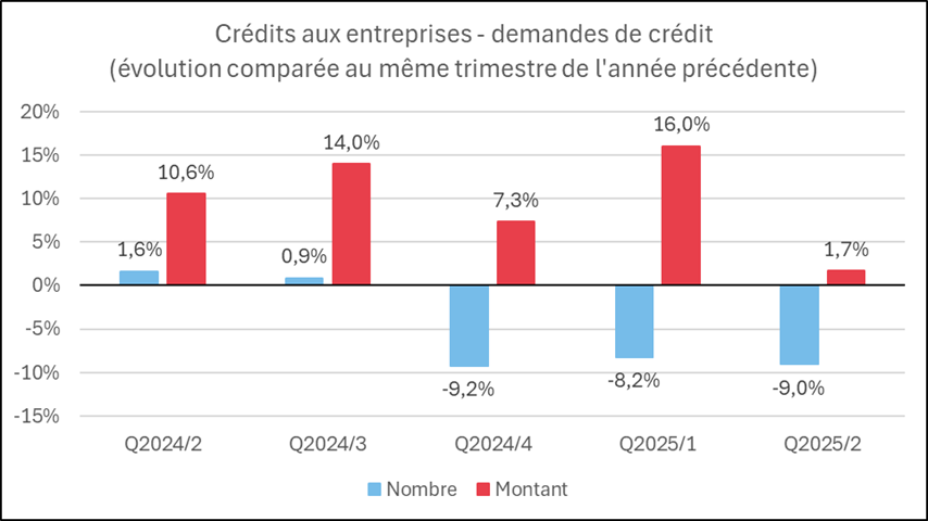 La hausse en termes de montant ne signifie toutefois pas que le nombre de crédits demandés et accordés ait également augmenté. En effet, au deuxième trimestre 2025, le nombre de crédits aux entreprises demandés a diminué de 9,0 % par rapport à la même période en 2024. Le nombre de crédits accordés a pour sa part baissé de 2,5 %.