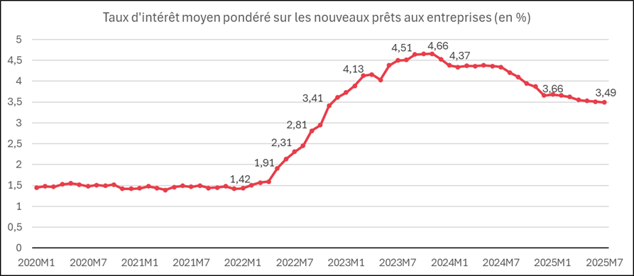 Le taux d'intérêt moyen pondéré sur les nouveaux crédits aux entreprises avait atteint un pic de 4,66% en novembre 2023. En juillet 2025, ce taux d’intérêt moyen était déjà redescendu de plus d’un point de pour cent à 3,49%. Les taux d'intérêt des crédits aux entreprises suivent ainsi la baisse des taux directeurs de la Banque centrale européenne et non la hausse des taux d'intérêt des obligations d'État à long terme.