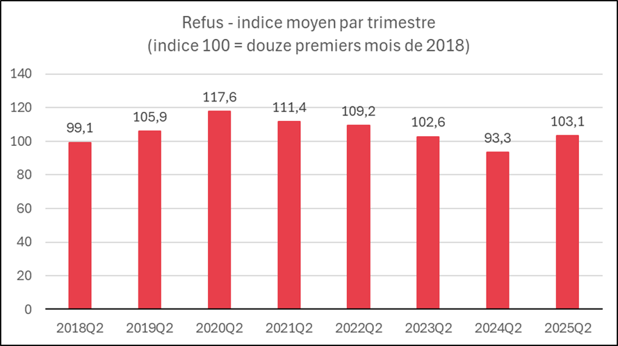 D’un côté, le degré de refus a été un peu plus élevé au deuxième trimestre de 2025 qu’au cours du deuxième trimestre des deux années précédentes, mais demeure finalement toujours faible.