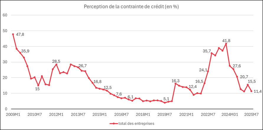 Le graphique ci-dessous montre l'évolution de la perception des contraintes de crédit. Une diminution traduit la perception d'un assouplissement des conditions de crédit. Une augmentation, quant à elle, indique que les entreprises pensent qu'il est moins facile d’obtenir un crédit.