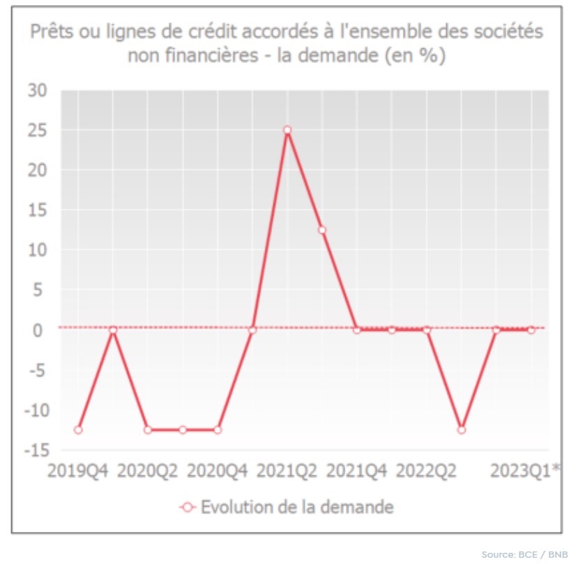 Dans l'enquête sur l’octroi de crédits bancaires (Bank Lending Survey), les quatre grandes banques indiquent que la demande de crédits ou de lignes de crédit par des sociétés non financières est restée stable au quatrième trimestre 2022. Pour l'avenir, les grandes banques s'attendent également à ce que la demande reste inchangée ou quasi inchangée.
