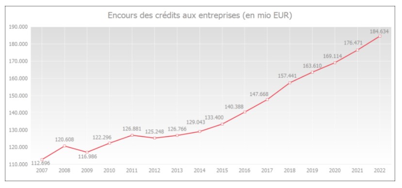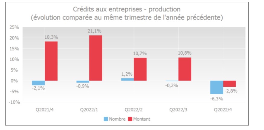 L'encours des crédits aux entreprises à fin décembre 2022 était en hausse de 4,6 % par rapport à l'année précédente, atteignant 184,6 milliards d'euros. Le nombre et le montant des crédits octroyés ont tous deux diminué. Au quatrième trimestre 2022, les crédits octroyés ont baissé de 6,3 % par rapport au même trimestre de l'année précédente. Les montants accordés se sont contractés de 2,8 %.