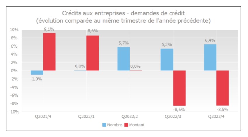 Si l'on se penche sur les demandes de crédits des entreprises, l’on constate que leur nombre reste plus élevé au quatrième trimestre 2022 qu'à la même période de 2021, mais le montant total de ces crédits demandés chute assez fortement.