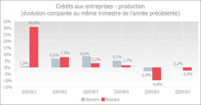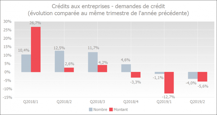 Au deuxième trimestre de 2019, les entrepreneurs ont demandé 4,0 % de crédits de moins que durant la même période l'an dernier. En termes de montant, la baisse est de 5,6 %.