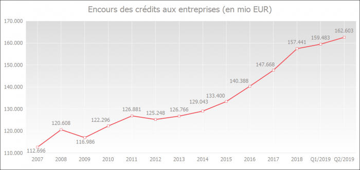 L'encours des crédits aux entreprises a augmenté de 4 % entre mi-2018 et mi-2019. Avec 162,6 milliards d'euros, il a atteint un nouveau record fin juin 2019.
