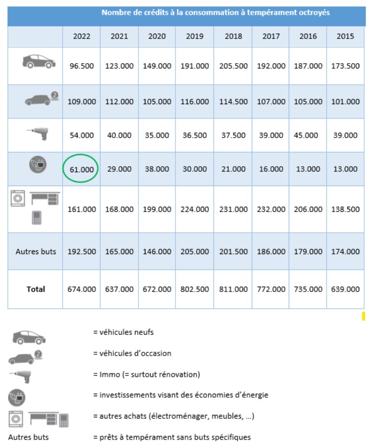 Le nombre de crédits à la consommation accordés par les membres de l’UPC en Belgique est reparti à la hausse en 2022 après une baisse en 2021. Un total de 674.000 crédits ont été accordés en 2022, avec une augmentation de plus de 110% du nombre de crédits écoénergétiques accordés.