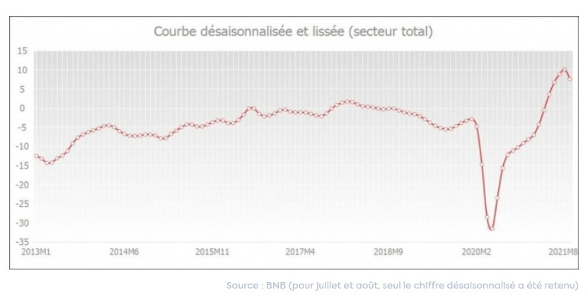 Après une forte baisse de la confiance des entreprises au début de la pandémie, nous avons assisté à une hausse régulière au cours des derniers mois, sauf en août. En juillet, la confiance des entreprises était même à son plus haut niveau depuis des années. Cela suggère que la demande de crédits d'investissement va reprendre (fortement) dans les mois à venir.