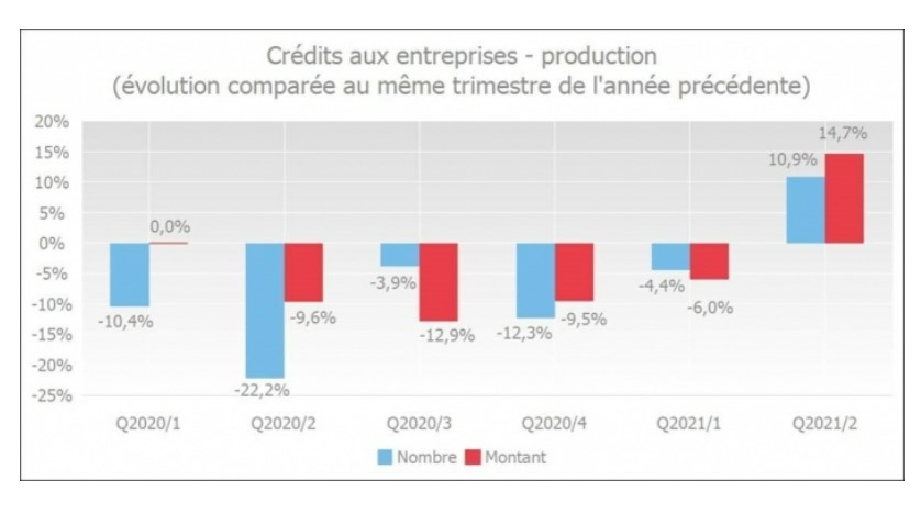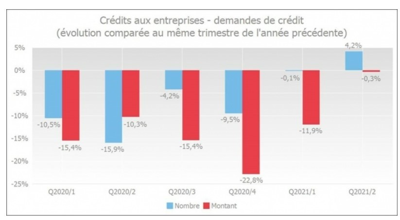 Au deuxième trimestre de 2021, les entrepreneurs ont demandé 4,2 % de crédits de plus qu'à la même période de l'année précédente. Après neuf mouvements consécutifs à la baisse, il s’agit là de la première augmentation à nouveau enregistrée. En montant, une très légère baisse a encore été notée, mais celle-ci a été beaucoup plus limitée qu'au cours des trimestres précédents.
