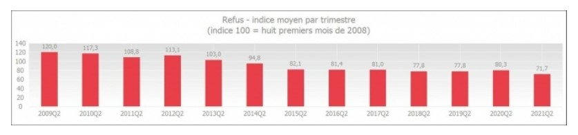 Le degré de refus est à son plus bas niveau, comparé au degré de refus de tous les deuxièmes trimestres depuis le début des mesures. Dans la mesure où la crise du coronavirus n'était pas complètement terminée, il est remarquable que le degré de refus soit si faible.