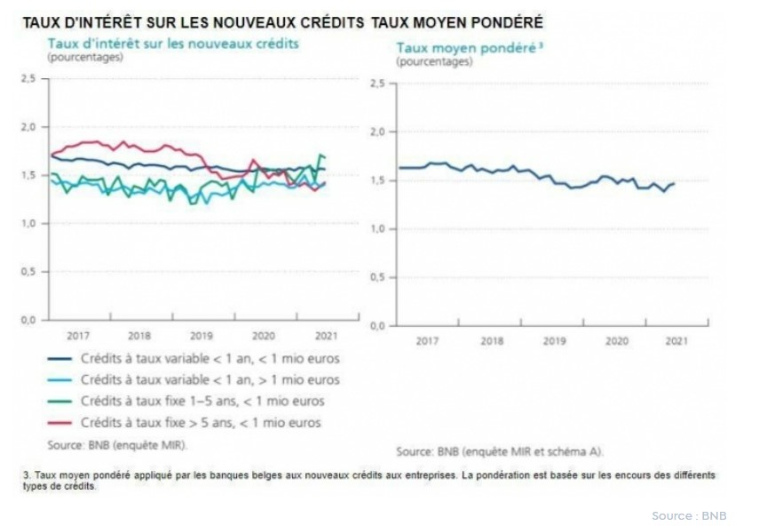 Selon les données de la BNB, le taux d'intérêt moyen pondéré des nouveaux crédits aux entreprises a légèrement augmenté pour atteindre 1,47% en juin 2021 (contre 1,45% en mai 2021). Depuis avril 2019 déjà, le taux d'intérêt moyen pondéré oscille autour de 1,50 %.